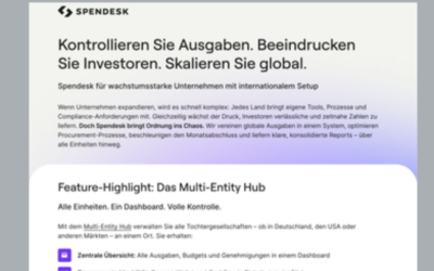 Kontrollieren Sie Ausgaben. Beeindrucken Sie Investoren. Skalieren Sie global. Alle Einheiten. Ein Dashboard. Volle Kontrolle. Mit dem Multi-Entity Hub verwalten Sie alle Tochtergesellschaften – ob in Deutschland, den USA oder anderen Märkten – an einem Ort. Sie erhalten: Zentrale Übersicht: Alle Ausgaben, Budgets und Genehmigungen in einem Dashboard Transparente Liquidität: Gesamt-Wallet und Cashflow je Einheit…